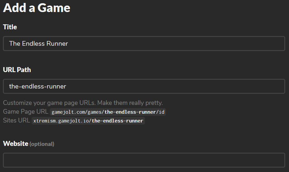 The next page requires you to fill in the details for your game like its name, URL-slug, game website, etc. You can get your desired URL by typing it into the field as long as it's available. A website can also be supplied if you have one.