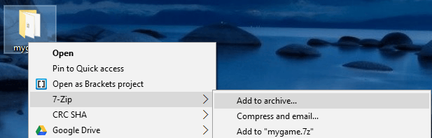 To archive your game folder, you are going to need an archiving tool. The one I'm using is called 7-Zip I have been using 7-Zip for ages, to be honest, I can't even remember using anything else so this is what I recommend. After downloading and installing it, just right click on the folder containing your game and we should have 7-Zip in your list with the option to add to the archive.