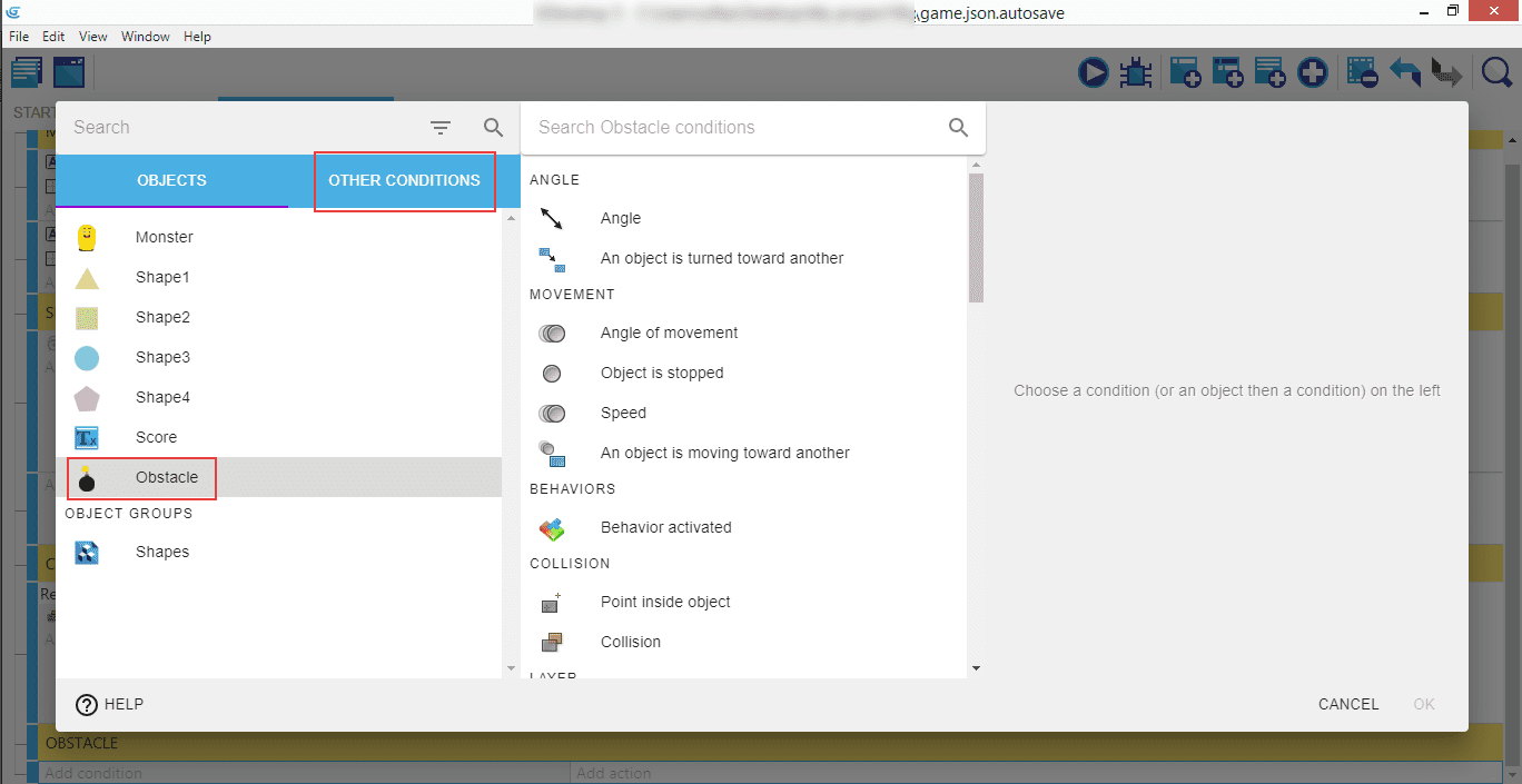 Within "Timers and time", select "Value of a scene timer". In the right panel, enter "Time in seconds" which will be 5, select "greater than", and enter "Timer's name" as "ObstacleCreation".